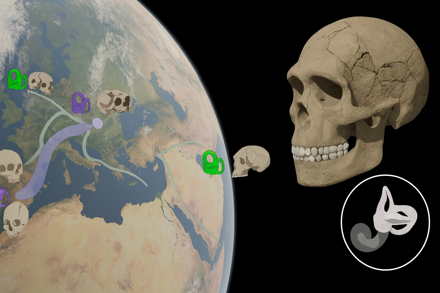 عمل فني حول التمثيل التخطيطي لتوزيع التنوع المورفولوجي للأذن الداخلية على مر الزمن في إنسان نياندرتال.