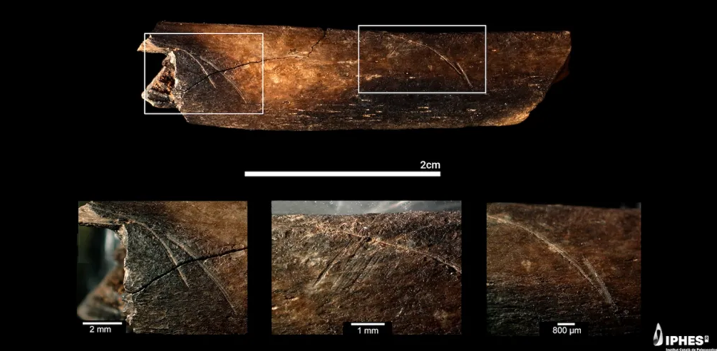 ضلع حيوان صغير عليه علامات قطع عُثر عليه في المستوى TE7 من جبل الفيل (سييرا دي أتابويركا، بورغوس). أسفل اليسار، علامات قطع متقطعة بشق. في المنتصف، علامات قطع متقطعة بخطوط تآكل (دوس). على اليمين، تفاصيل علامة القطع.