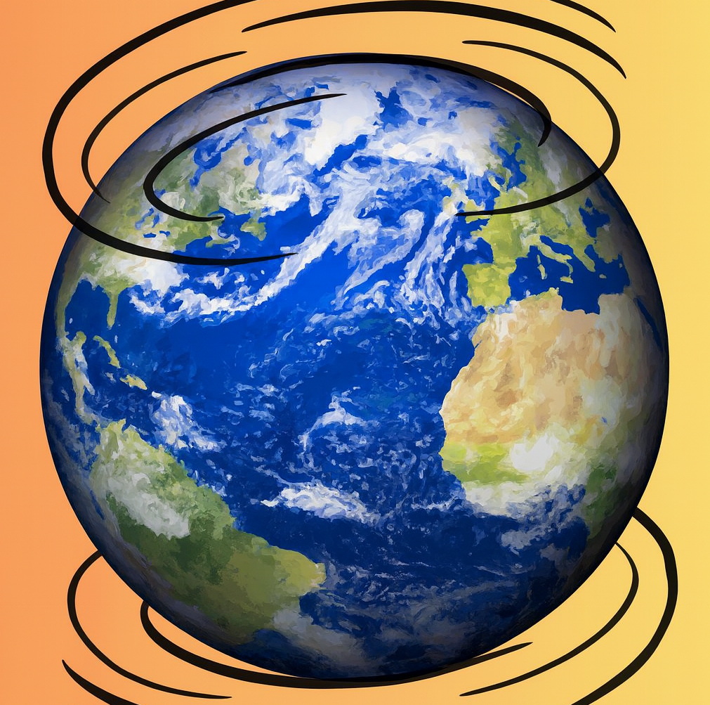 الأرض تدور حول محورها بسرعة تقارب 1670 كم/س عند خط الاستواء، لكننا وجميع ما على سطحها — من هواء، وبحار، ومباني، وحتى أجسامنا تدور بنفس السرعة وفي الاتجاه نفسه.