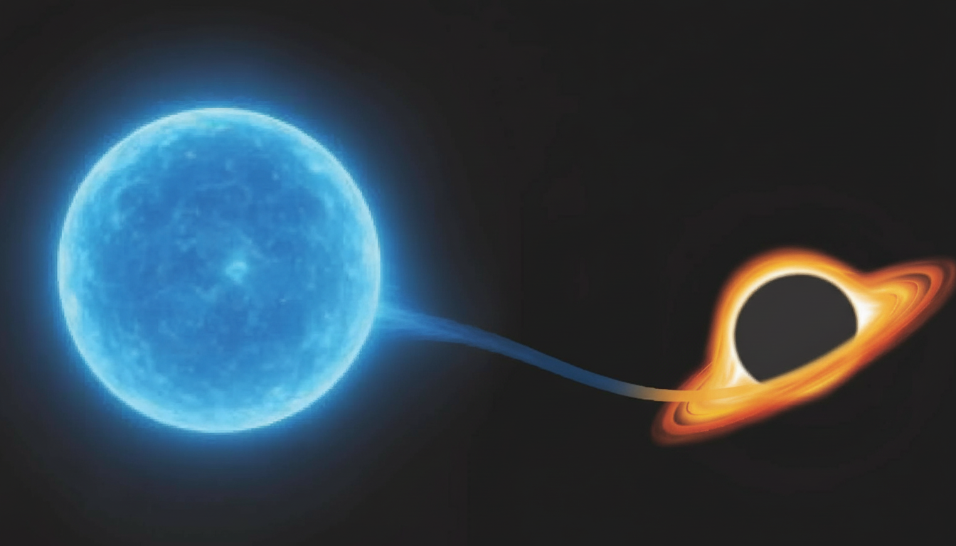 رسم فني لنجم ضخم غير محظوظ يقترب من ثقب أسود فائق الكتلة.