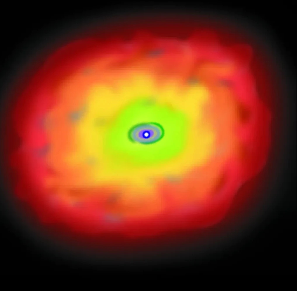 يخبرنا صدى الأشعة تحت الحمراء أن حلقة غبارية تحيط بالثقب الأسود المركزي وقرص التراكم الذي تم تشكيله حديثًا.