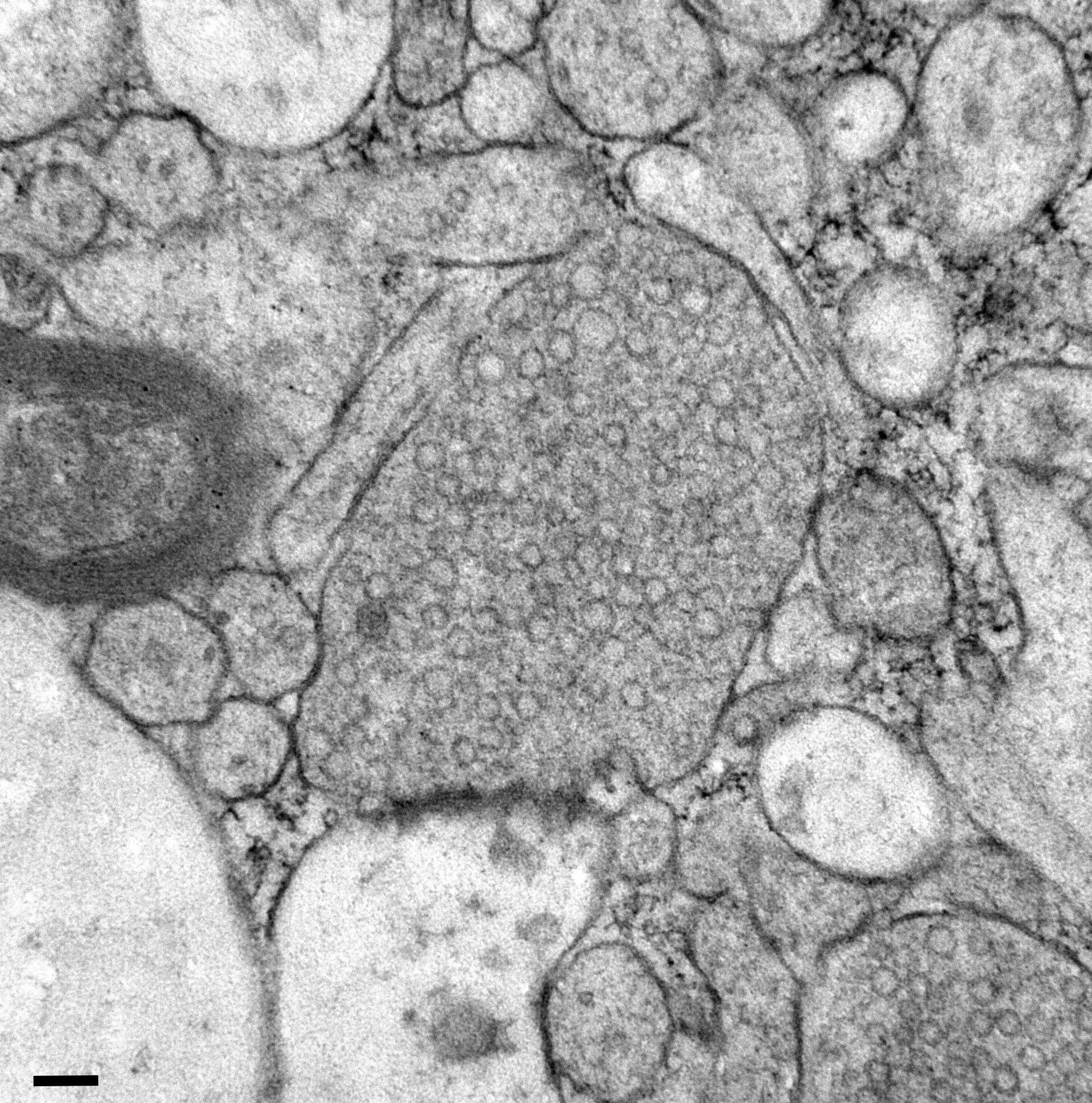نسيج دماغ بشري مُستأصل، مُجمد بعد 100 مللي ثانية من التحفيز، يُظهر بنيةً داخلية. مقياس الشريط = 100 نانومتر.