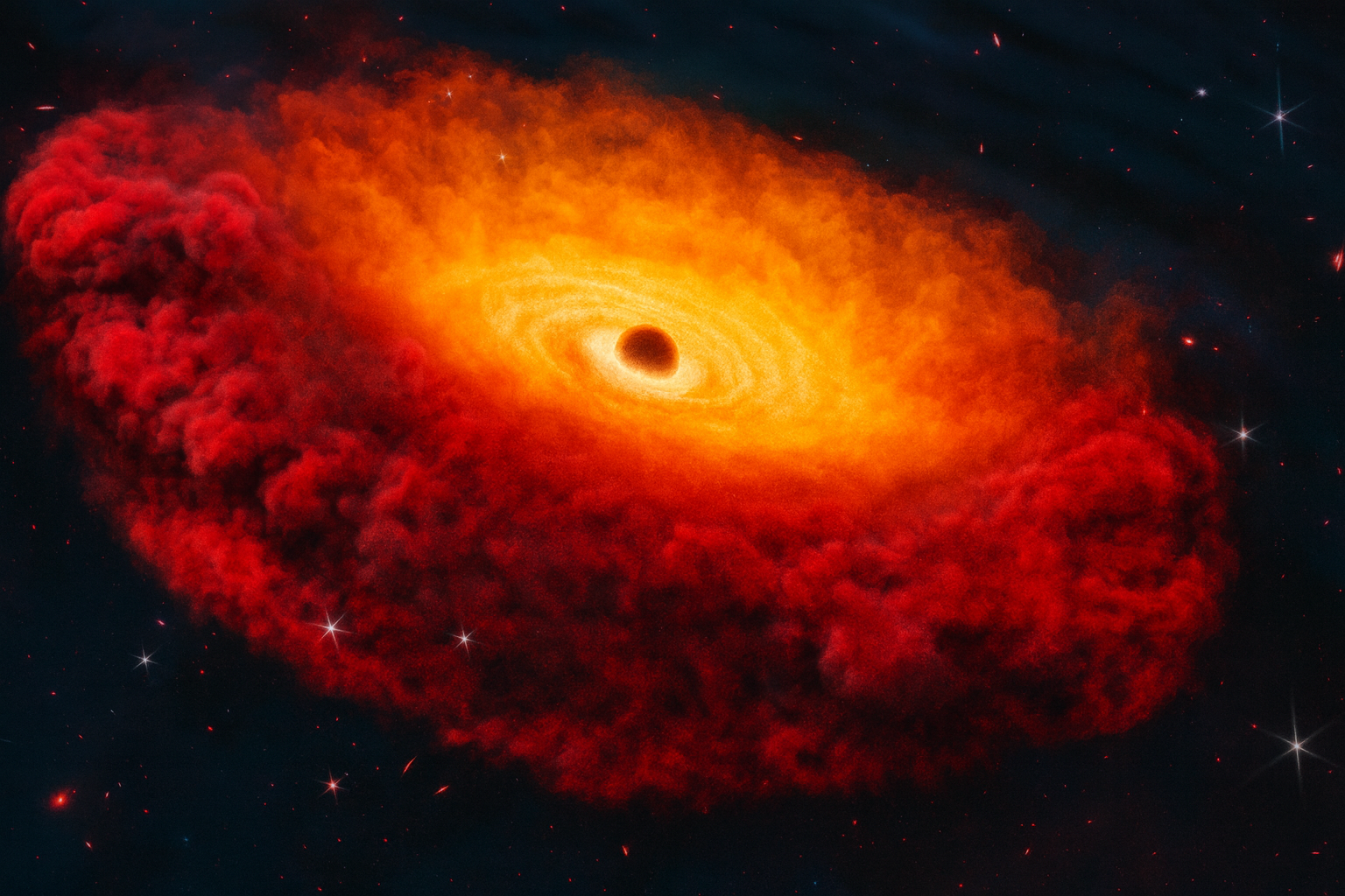 تمثيل فني لمجرة CAPERS-LRD-z9، موطن أقدم ثقب أسود مؤكد. يُعتقد أن الثقب الأسود الهائل في مركزها محاط بسحابة كثيفة من الغاز، مما يمنح المجرة لونًا أحمر مميزًا