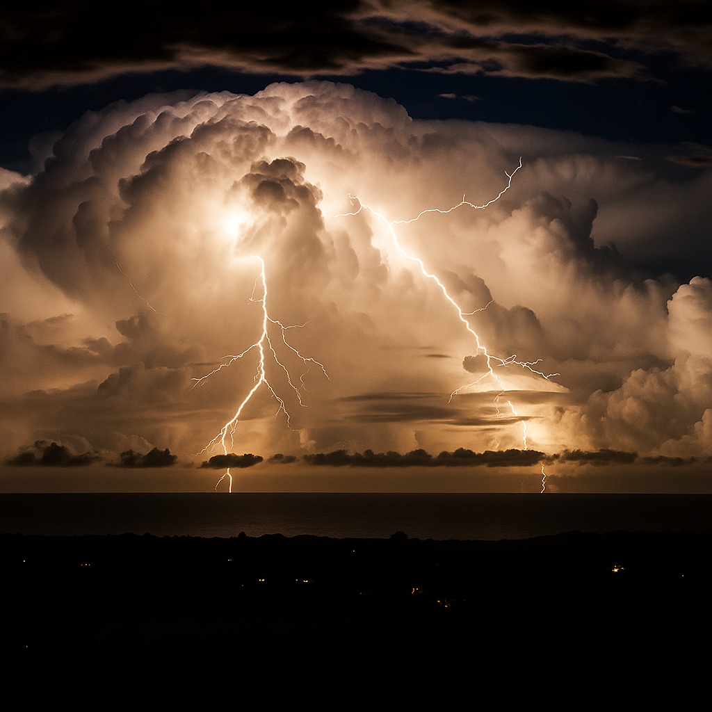 عاصفة رعدية قبالة ساحل خليج بايرون، أستراليا. سماء متغيرة الألوان تتألق بعرض ضوئي طبيعي من صواعق البرق، وغيوم متصاعدة تتراقص في السماء لساعات.
