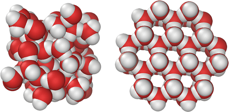 الجليد الكبير: يتكون الماء السائل (يسار) من ذرات الهيدروجين (أبيض) والأكسجين (الأحمر) مرتبة في هيكل رباعي السطوح تقريبًا. يُظهر الجليد الشائع ، أو Ice Ih (على اليمين) ، شبكة ثلاثية الأبعاد أقل كثافة ، وتشرح سبب تطفو الجليد على الماء.