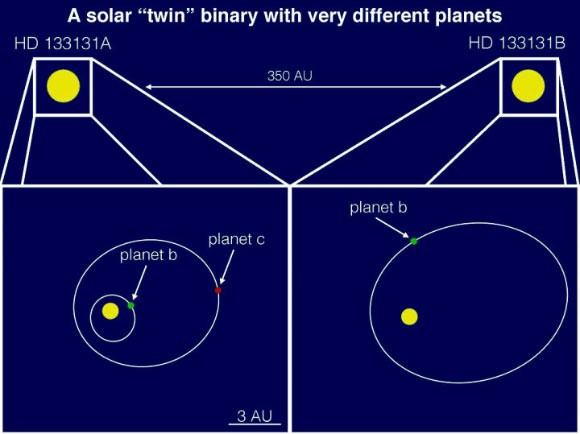 يمتلك هذا النظام ذو النجم المزدوج مجموعة كبيرة من ثلاثة كواكب خارجية (عملاقة غازية ، مثل كوكب المشتري أو زحل). على عكس معظم أنظمة النجوم المتعددة ، حيث عادةً ما يؤوي نجم واحد فقط كوكب خارجي ، في هذا النظام يكون لكلا النجمين عالم واحد على الأقل في مداره.