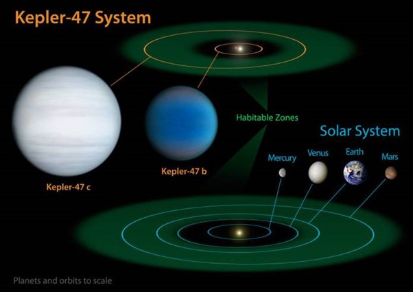 نظام نجمي دائري (نظام يدور فيه كوكب حول نجمين بدلاً من نجم واحد فقط ، كما في حالة النظام الشمسي) ؛ يعتبر نظام Kepler 47 فريدًا من نوعه في أن كوكبين خارج المجموعة الشمسية يدوران حول هذا النظام ذي النجمتين ، بدلاً من كوكب واحد فقط. من المحتمل أن يكون كلا الكواكب الخارجية جوفيان ، وكما هو الحال في الأنظمة الدائرية ، يدور هذان العالمان أيضًا بالقرب من المنطقة الصالحة للسكن لمضيفيهما (HZ ، حيث يمكن أن يوجد الماء على سطح الكوكب في شكل سائل) - ربما له علاقة بالجاذبية؟