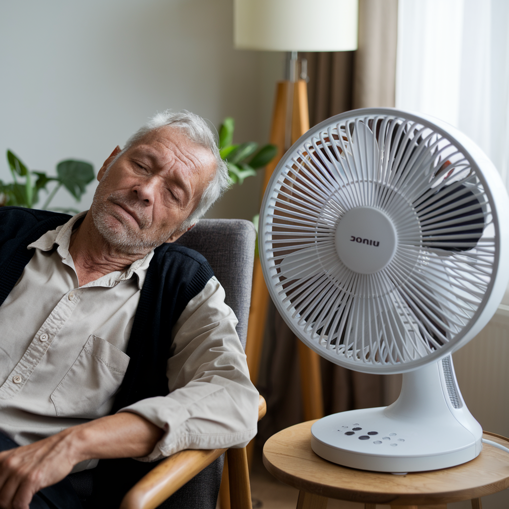 للحفاظ على البرودة خلال موجات الحر، يستخدم العديد من الأشخاص المراوح الكهربائية. هنا، يستريح رجل بجوار مروحة خلال موجة الحر،. لكن المراوح الكهربائية وحدها قد لا توفر الكثير من الراحة لكبار السن خلال موجات الحر الشديدة.