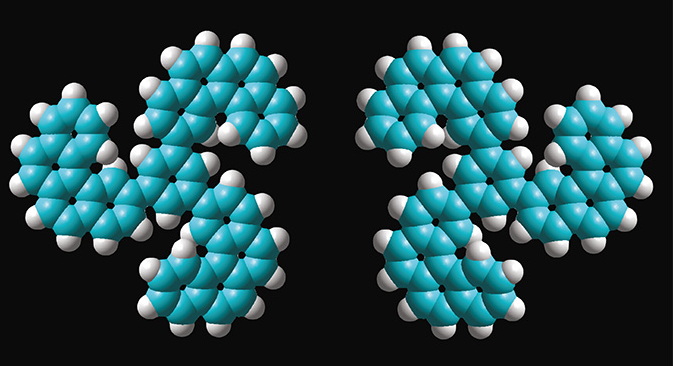 يُظهر محاكاة عن قرب النسختين المرآتين لجزيء التريس (رباعي هيليسين البنزين)، والذي يتكون من ذرات الكربون (الأزرق) والهيدروجين (الأبيض).