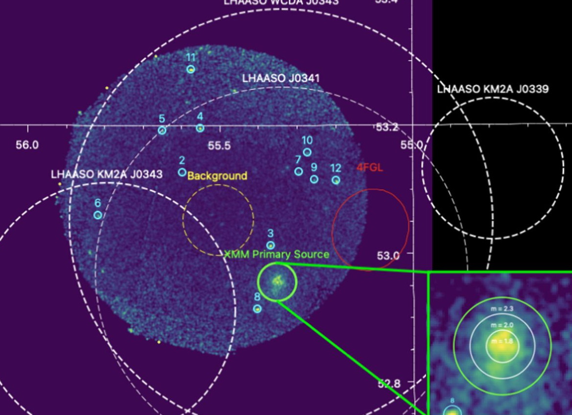 صورة بالأشعة السينية لسديم رياح النجم النابض المُكتشف حديثًا والمرتبط بمصدر أشعة كونية مجري شديد 1LHAASO J0343+5254u، التُقطت بواسطة تلسكوب XMM-Newton الفضائي (DiKerby, Zhang, et al., ApJ, 983, 21).