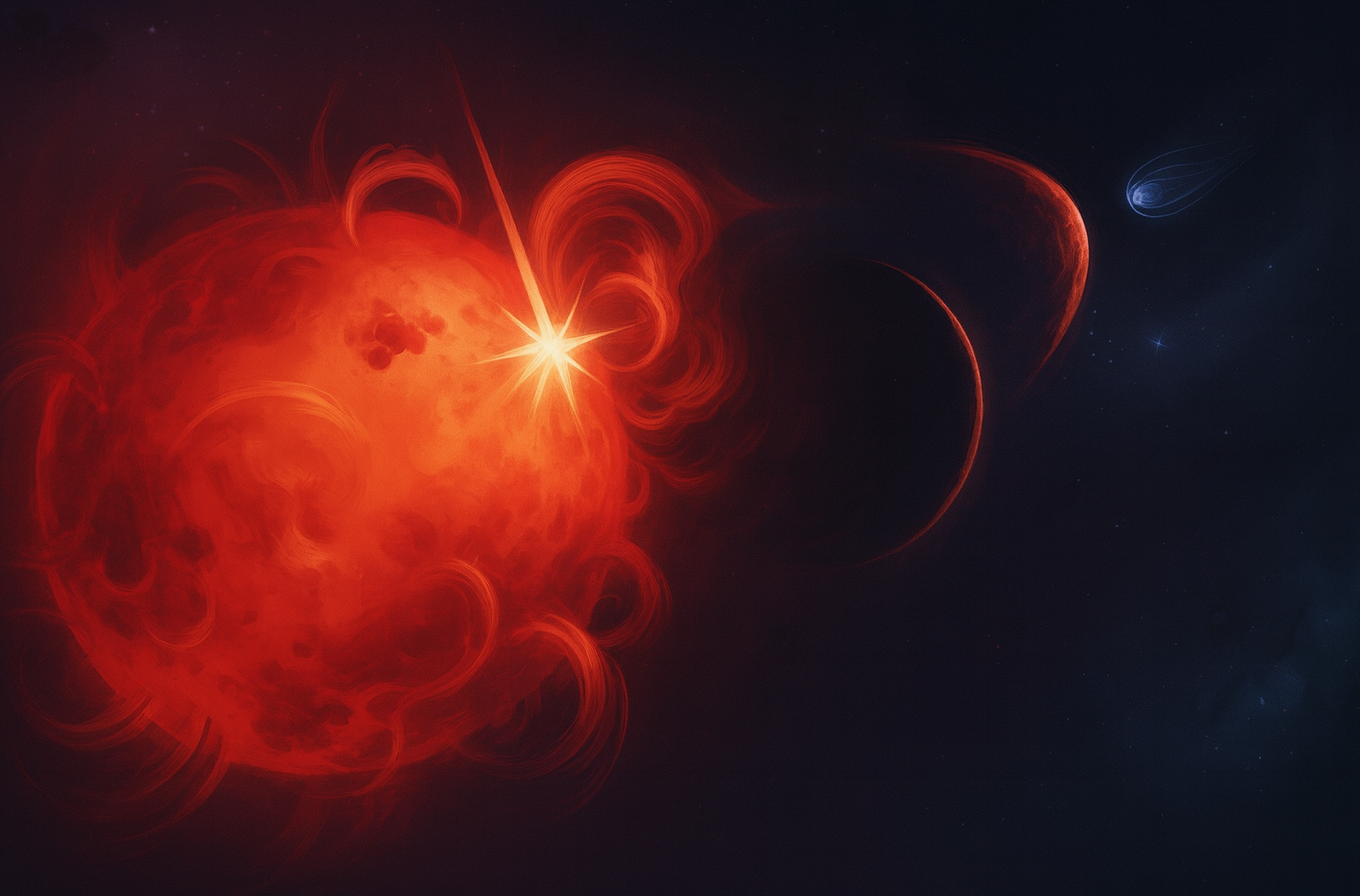 انطباع فني لنجم أحمر ضخم يطلق ومضة انفجارية ساطعة من الضوء. تحيط بالنجم أنماط حمراء وبرتقالية دوّامية تشير إلى نشاط شديد. في الخلفية يظهر كوكب أزرق صغير مع أثر خافت يمتد مبتعدًا عنه، ما يدل على أن غلافه الجوي يتعرّض للانجراف. تتوضع المشاهدة على خلفية فضاء داكنة مرصعة بالنجوم.